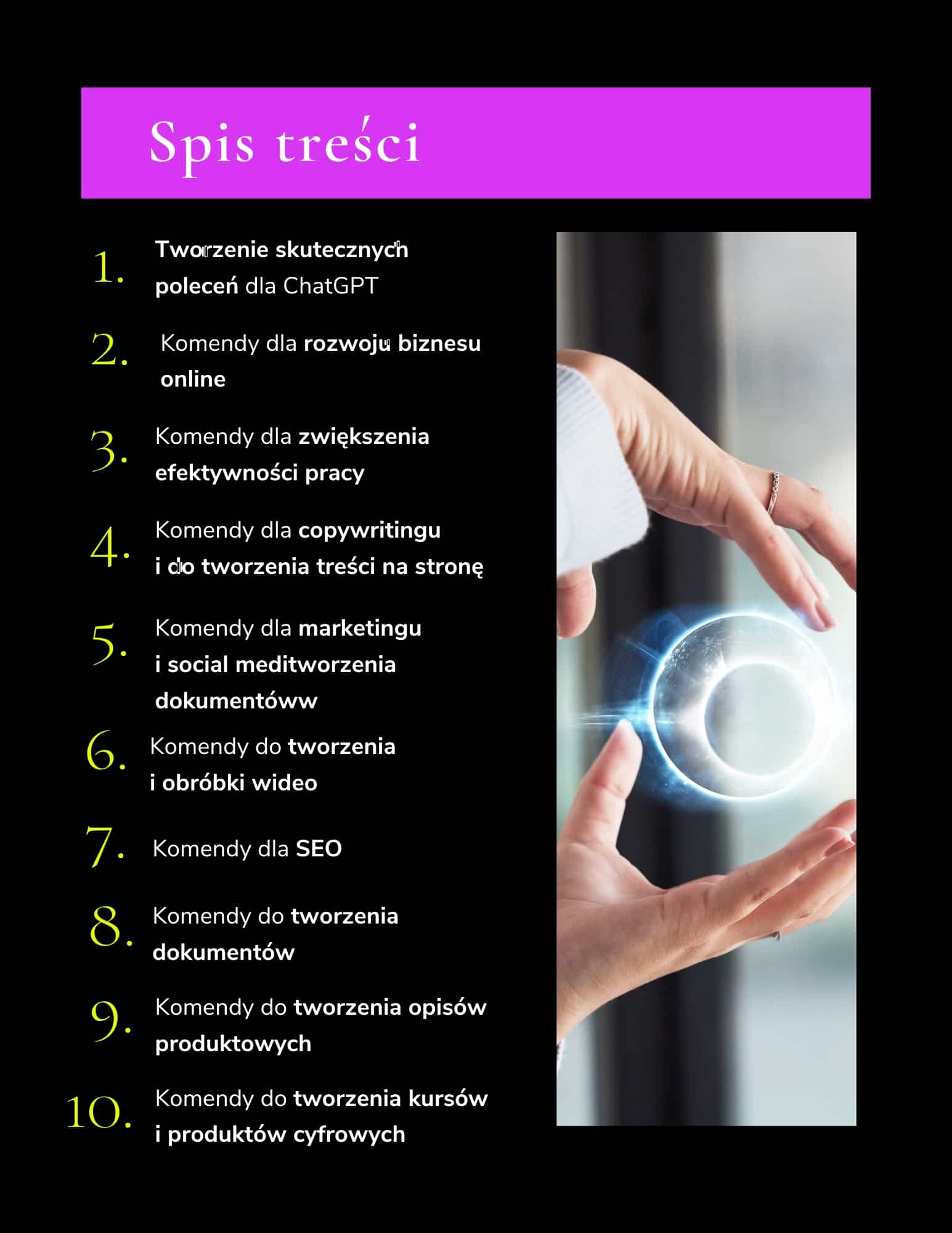 ponad 100 gotowych promptów podzielonych na kategorie (biznes, copywriting, social media, SEO, kursy online i inne),